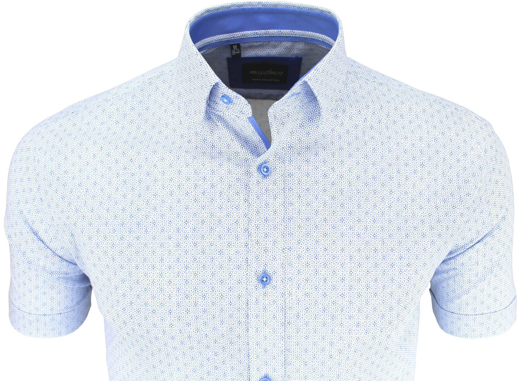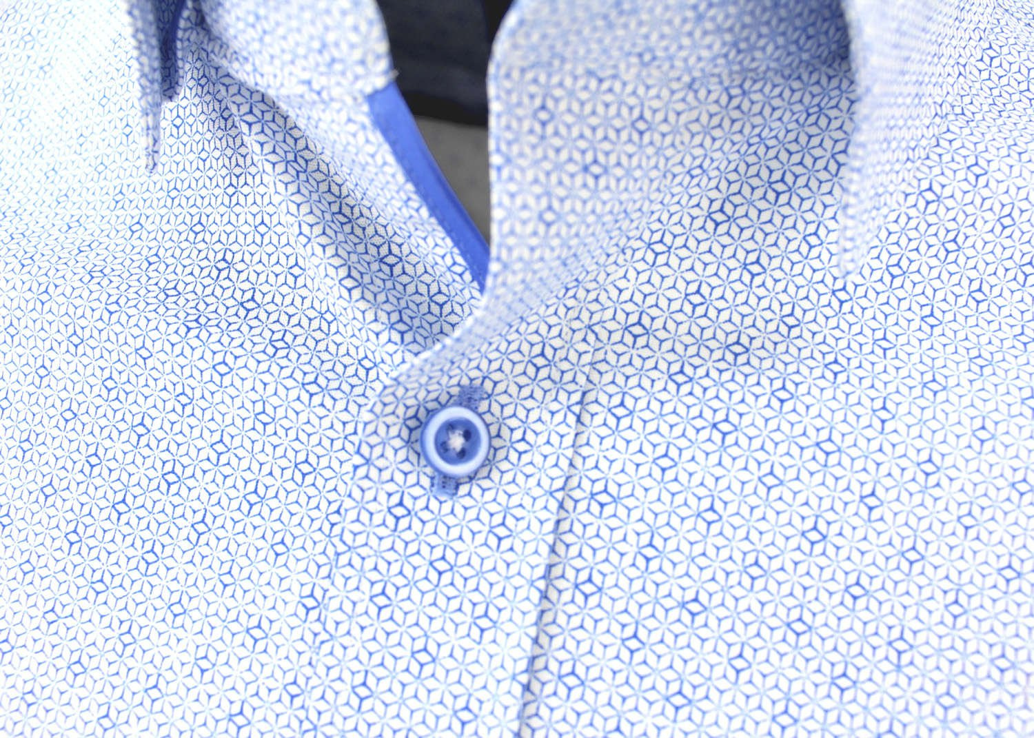 - Koszula męska niebieska, delikatny nadruk. Krój regularny prosty dla tęższych panów duże koszule szyte do rozmiaru 4XL. 97% bawełny i 3% elastanu dla poprawienia elastyczności materiału. Bardzo wygodna, dobrze się prasuje.