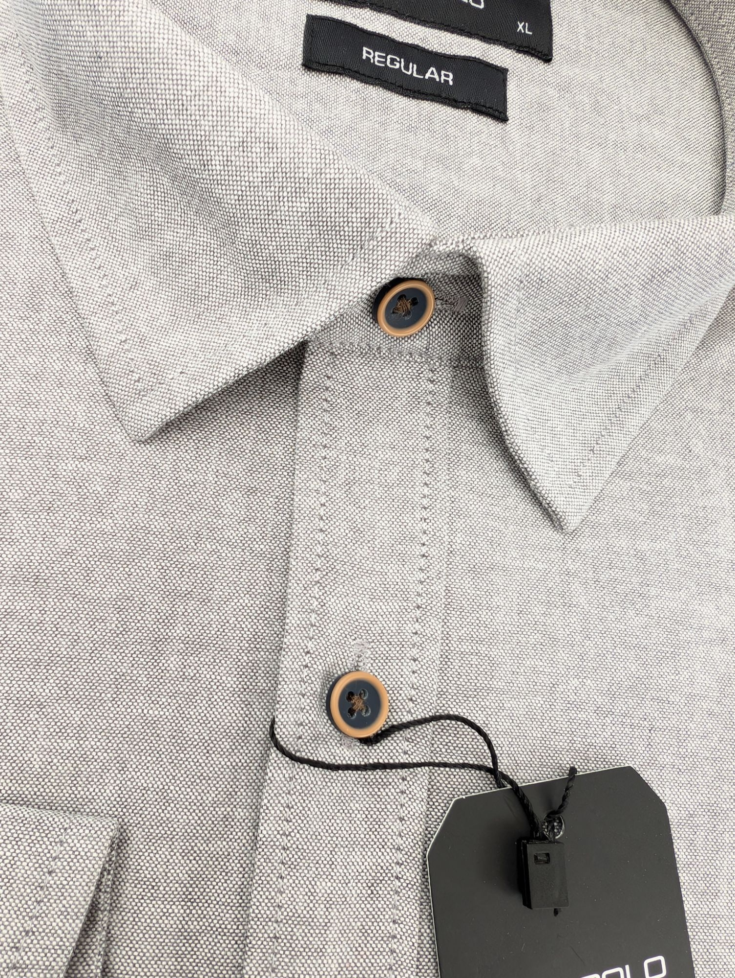 - Szara koszula męska w kroju regularnym i długim rękawem. Koszula zapinana na guziki, z jedną kieszonką po lewej stronie. Skład materiału 75% bawełna i 25% poliester. Koszula z kołnierzykiem z ukrytym przypięciem.